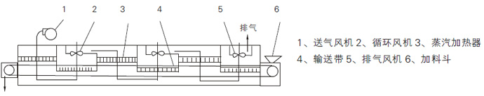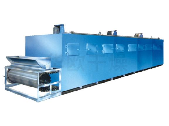 任務道理:物料由加料器平均地鋪在網帶上,網帶普通接納12-60目不銹鋼絲網,由傳動裝配拖動在枯燥機內挪動。枯燥機由多少單位構成,每單位熱風自力輪回,局部尾氣由特地排濕風機排擠,每單位排擠廢氣時均有由調理閥節制,熱氣由上往下或由下往上穿過鋪滿物料的網帶實現熱量與品德通報的歷程,帶走物料水份。網帶遲緩挪動,運轉速率可按照物料溫度自在調理,枯燥后的成品持續落入收料器中。高低輪回單位按照用戶須要可矯捷裝備,單位數目亦可按照須要拔取。